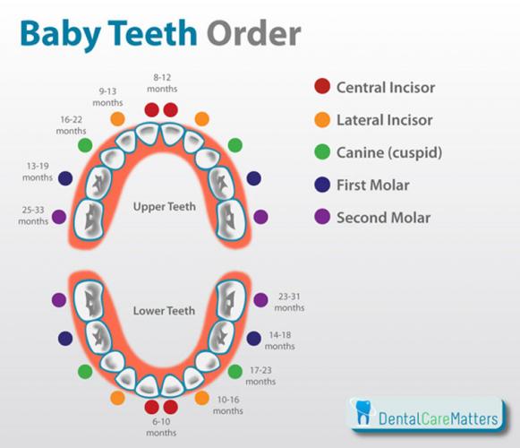 Возраста на бебето кога ќе се појават првите заби е индивидуална работа и може многу да варира. Во просек првите запчиња се појавуваат на 6-8 месеци, но кај некои бебиња може да се појават и на 3 месеци или на една година. Скиците се ориентациони.