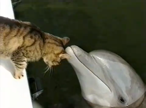 Повеќе студии го покажаа позитивното влијание кое го имаат животните врз луѓето и децата. Ова е едно прекрасно видео на кое се гледа како мачка се гали со делфини. Уживајте во природата.