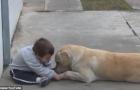 Видеото го снимила мајката на двегодишното детенце со даунов синдром. На почетокот тоа се повлекува, но нежното куче не се откажува од намерата да се спријателат.